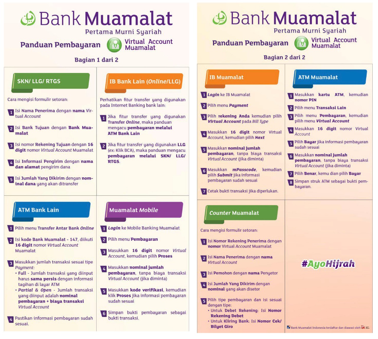 Jika transaksi antar bank (teller, ATM, Ibanking, dll) maka dibutuhkan kode bank Muamalat yaitu 147 di depan no VA, cara penulisan nomor rekening VA di layar menjadi [kode bank + nomor VA] |